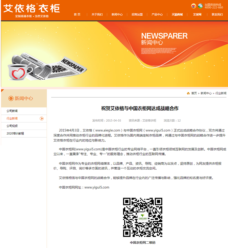 2015年4月3日,艾依格与瑞翔传媒旗下中国衣柜网(www.yigui5.com)正式达成战略合作协议,双方将通过深度合作共同推动衣柜行业的品牌化进程。艾依格作为国内高端定制衣柜品牌,将通过与中国衣柜网的战略合作进一步提升艾依格衣柜在行业内的地位与影响力。
