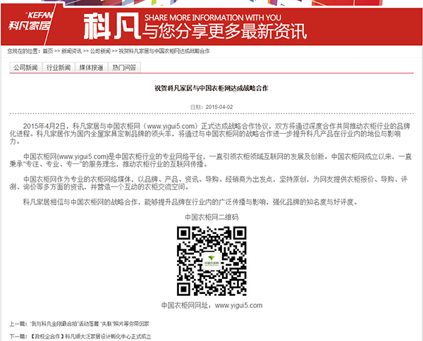 2015年4月2日,科凡家居与瑞翔传媒旗下中国衣柜网(www.yigui5.com)正式达成战略合作协议,双方将通过深度合作共同推动衣柜行业的品牌化进程。科凡家居作为国内全屋家具定制品牌的领头羊,将通过与中国衣柜网的战略合作进一步提升科凡产品在行业内的地位与影响力。