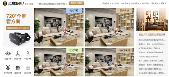 720°VR全景展示是网站上的特色展示,吸引用户进入了解风格案例;设置咨询按钮,互动更便捷。