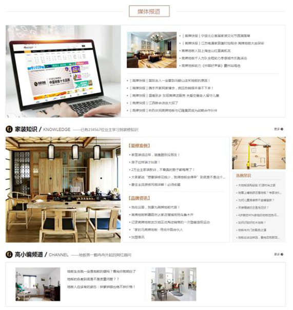 企业快报、行业资讯、家装知识以及品牌栏目展示,丰富网站内容。
